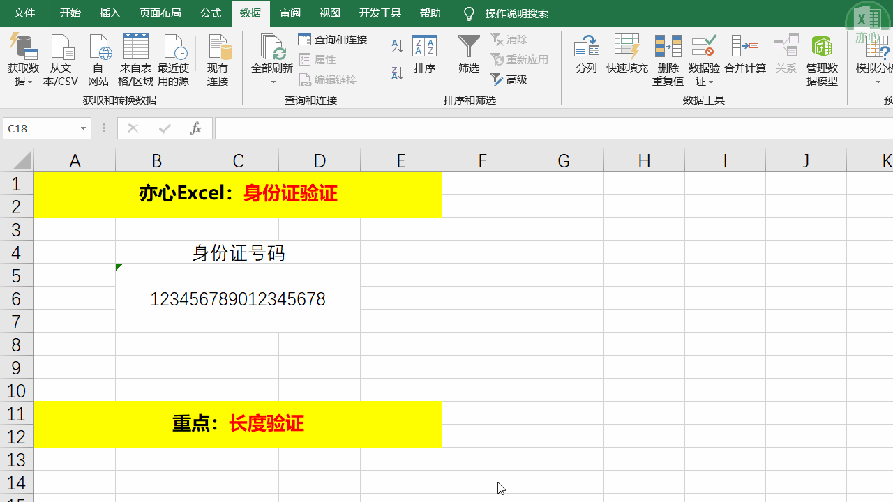 「数据验证」可以很好的解决这种情况,选中单元格区域,点击「数据」选项卡下「数据工具」命令组中「数据验证」,调出数据验证对话框,然后点击「设置」选项卡,允许选择「文本长度」,数据选择「等于」,长度选择「18」,最后点击确定即可。