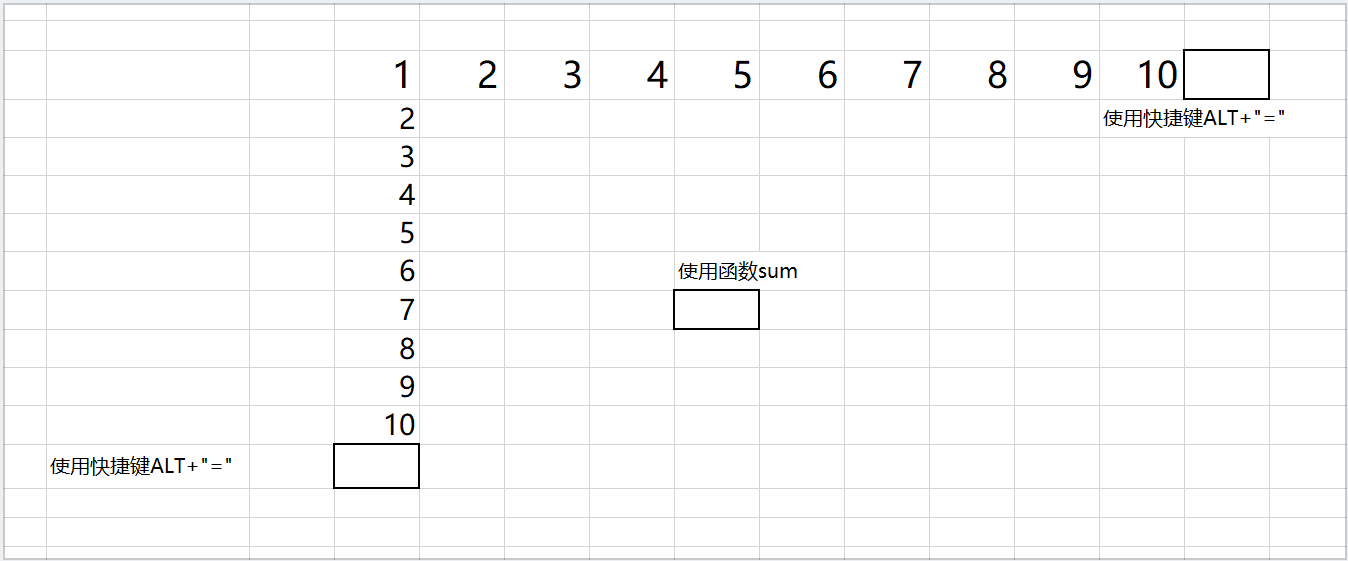 sum()函数对区域中的数值进行求和,除此之外,对于一行或一列的数据,我们还可以使用快捷键:ALT + "=" 的方式进行求解。